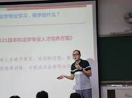 主讲人张涛结合现实生活中的例子让同学们明白法律学习更像是“学习语言”,在这个过程中不断积累丰富自己的“词汇”和“语法”。在解答提出的问题的同时也在引导同学们树立自己的目标,并着重讲解考研方向。最后,主讲人张涛希望大家能够认真学习,夯实基础,优质完成全部专业课程,学好英语,努力提升自己,掌握多项技能。