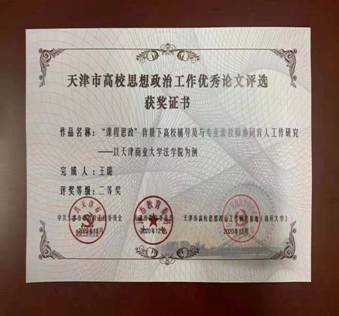 近日,市委教育工委、市教委公布了2020年度天津市高校思想政治工作优秀论文评选结果,公司王璐老师的论文《“课程思政”背景下高校辅导员与专业课教师协同育人工作研究——以beat365亚洲体育为例》获二等奖。