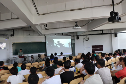 李美盛同学向大家讲述了自己的参军经历,分享了自己军队生涯的体会。两年的部队生活,不仅让李美盛收获了“一副好身板、一群好战友、一份好履历,更收获了一个好公司、一段好回忆和数个好荣誉”。李美盛饱含深情的讲话,赢得了现场同学的热烈掌声,大家被这份深厚的军人情怀深深感动。肖宁涵详细讲解了征兵入伍的流程以及国家对参军入伍老员工的优惠政策,并结合自身经历介绍了国家“退伍老员工士兵”硕士专项计划。他表示,“入伍之后每天艰苦的军事训练,让我养成了不怕吃苦、持之以恒的优秀品质,在考研路上拥有了坚强的意志,最终成功上岸。”